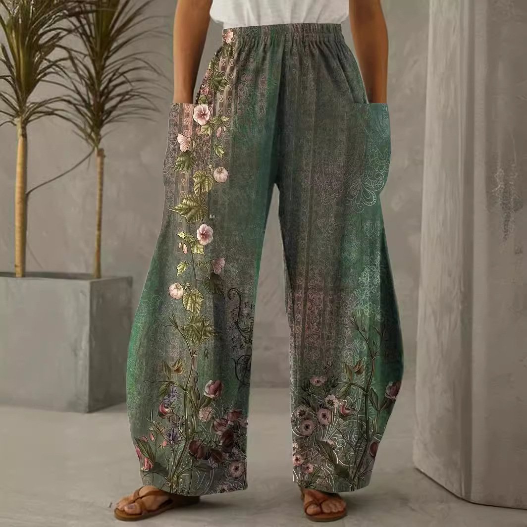 Spring And Summer Retro Floral Pattern Wide Leg Trousers Elastic Waist European And American Style Women’s Clothing
